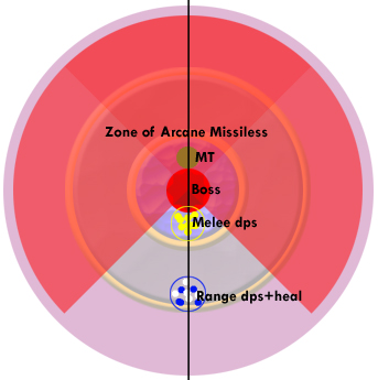 Arcane Missiless – основная дамажащая абилка босса. Босс кастует ее в рандомную цель (может быть тотемом – петом) в радиусе +/- 135 от текущей агроцели (сектор в 270 градусов). Безопасным местом является сектор в 90 градусов строго за спиной босса. Если никого не в радиусе – будут кастоваться в танка.
