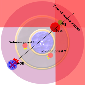 Через 10 секунд с момента появления Solarian Agents, появится босс и 2 Solarian Priests. В рейде должны быть определенны 2 пары милишников (дд вар+ рога/энханс шаман), ответственных за станы и кики Solarian Priests, появляющихся вместе с боссом. За каждой парой должен быть соответственно закреплен «левый» и «правый» луч, в котором они перехватывают аддов. Если в их луче появляется босс – тогда они перехватывают адда в «центральном» луче (схема 2). МТ должен быть готов перехватить босса в любом луче и максимально быстро отвернуть от основного рейда (схема 3).