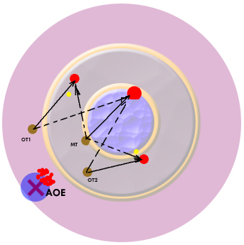 Данное построение должно выдерживаться все время (схема 1), пока босс находится в комнате. Это обеспечивает получение аркан мисслов только МТ. Отдельное расположение мили и рэнж дпса требуется для обеспечения ротации wrath of astromancer только между рэнж дпсом и хилом, тем самым обезопасив МТ от получения данного дебаффа. В случаях если мили получает Wrath of Astromancer – он должен отойти за спину рэнж дпсу и вернутся обратно к мили группе только после переходе первичного дебаффа на кого-то из данной группы (через 8 секунд).