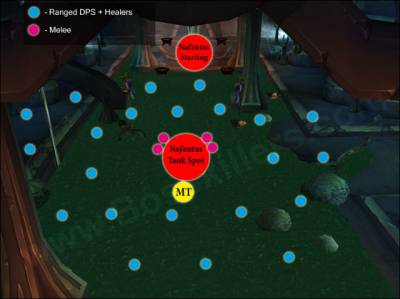 Необходимо расположить группы равномерно, а так же расставить людей в группах, т.к. Needle Spine дамажит всех в радиусе 6 ярдов. Босс держится между двумя столбами, группа милишников находится под боссом, немного рассредоточившись. Группа номер 3 стоит примерно на 6 часах, 2 и часть 1 на 9 часах, а 5 на 3х (группа 4 – группа мили, находящаяся под боссом) Расстановка показана на рисунке: